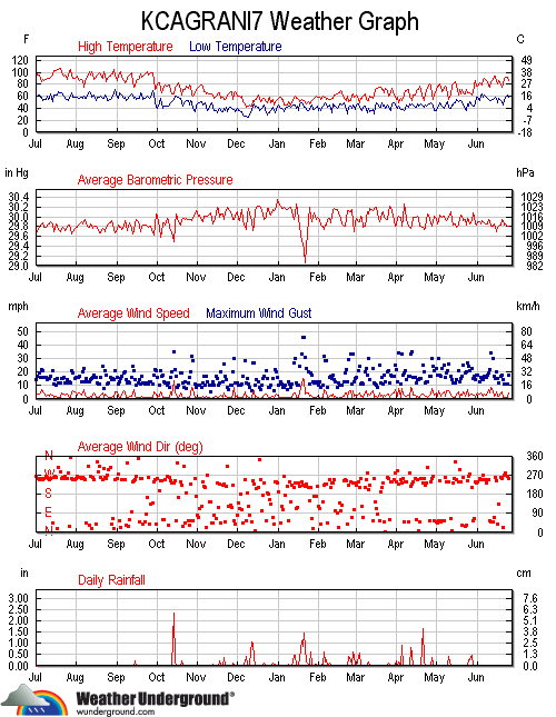The station equipment that we use is a solar powered wireless Davis Instruments Vantage Pro2. In addition to the Base weather station we have added a soil temperature probe and a soil moisture sensor. The entire weather station is located in the middle of our vineyard about 800 feet from the house where the ground station is for the wireless connection. The anemometer is on top of a guyed 10 meter pole in the vineyard. The air temperature and other sensors are located eight feet above the ground on the same pole in the vineyard. The Vineyard is 384 feet ASL. All of our weather data is updated every three seconds via the Internet to the Weather Underground which captures and creates these databases for us. Our weather station is visited online more than 700 times each month. We have no idea who these folks are. |